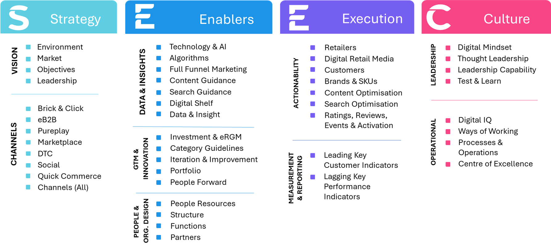 Our framework maps the roles and responsibilities of each function (from Leadership to Commercial, Marketing, eComm/ DComm, Supply Chain, Insights & Analytics, IT, Finance and HR) to the ultimate digital commerce strategy.